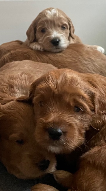 The Cockadoodledoo is a cross breed between Golden Retriever, Poodle, and Cocker Spaniel. That’s why you may have heard of them referred to as Golden Cockerdoodles, Cockerdoodlepoo, Cockadoodlepoo…the list goes on! Find out more about F1 Goldendoodles. For Cockapoo background, click here.