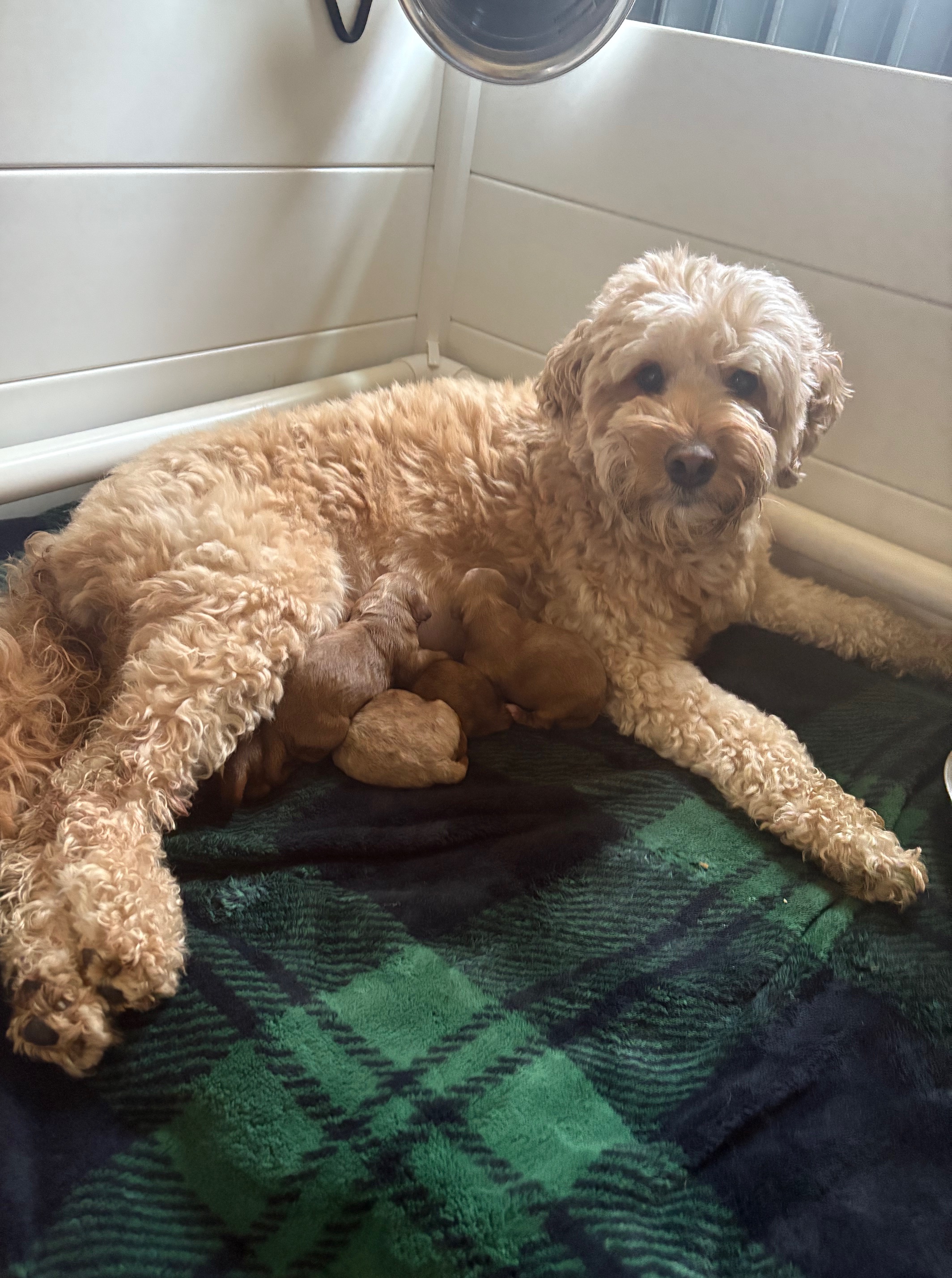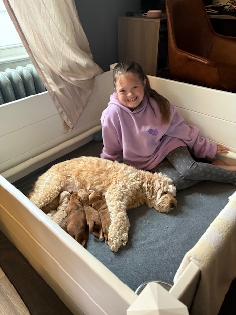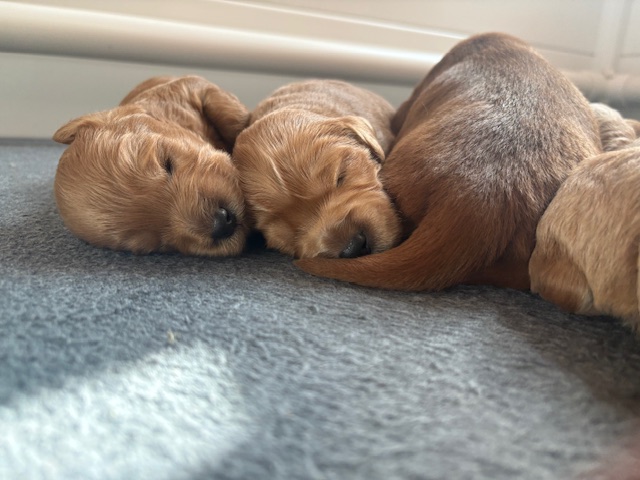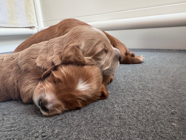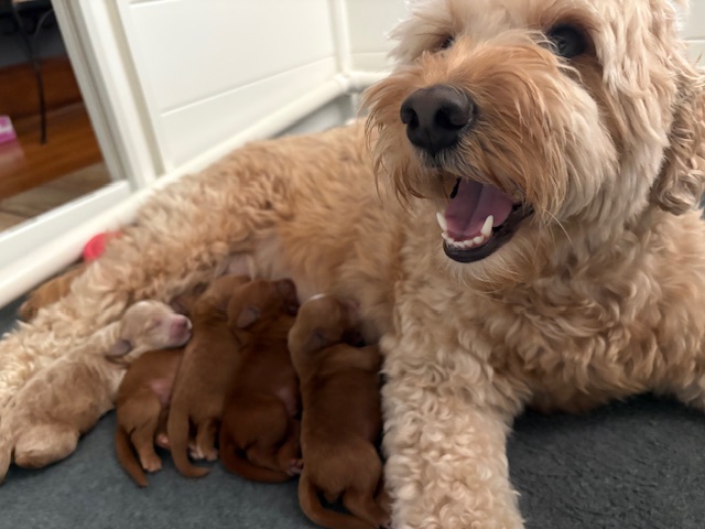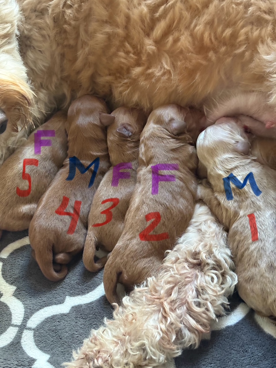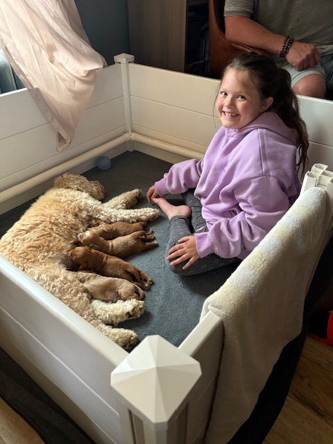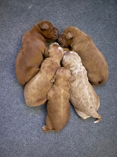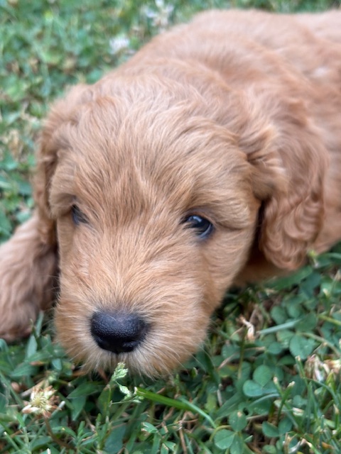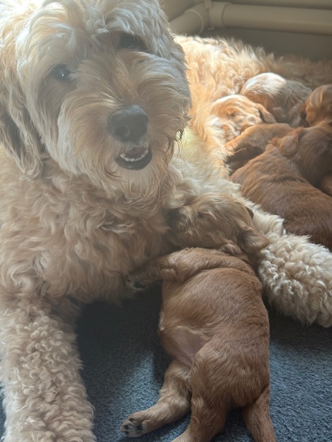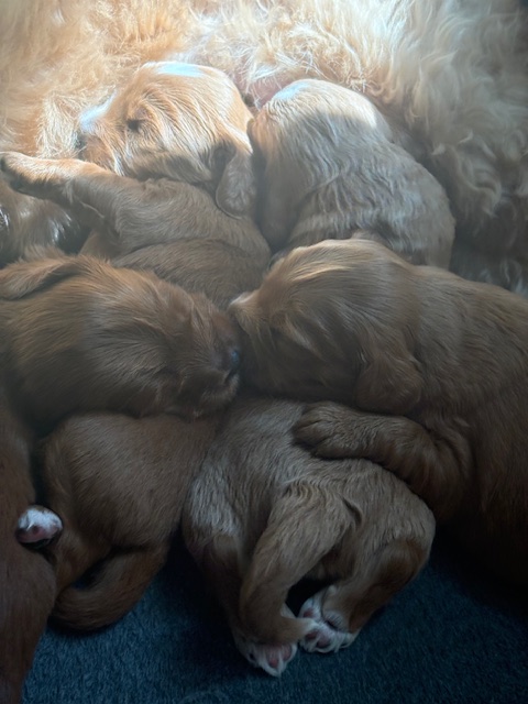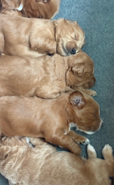 Izzy delivered 5 beautiful babies on June 3rd, 2025. Everyone is healthy and squeaky cute! The color variety on these goldens is super interesting! We have 3 female and 2 male Cockadoodledoos. These pups will be ready for selection the second week of July! There are 3 reservations available. Be sure to contact us to join our waitlist!